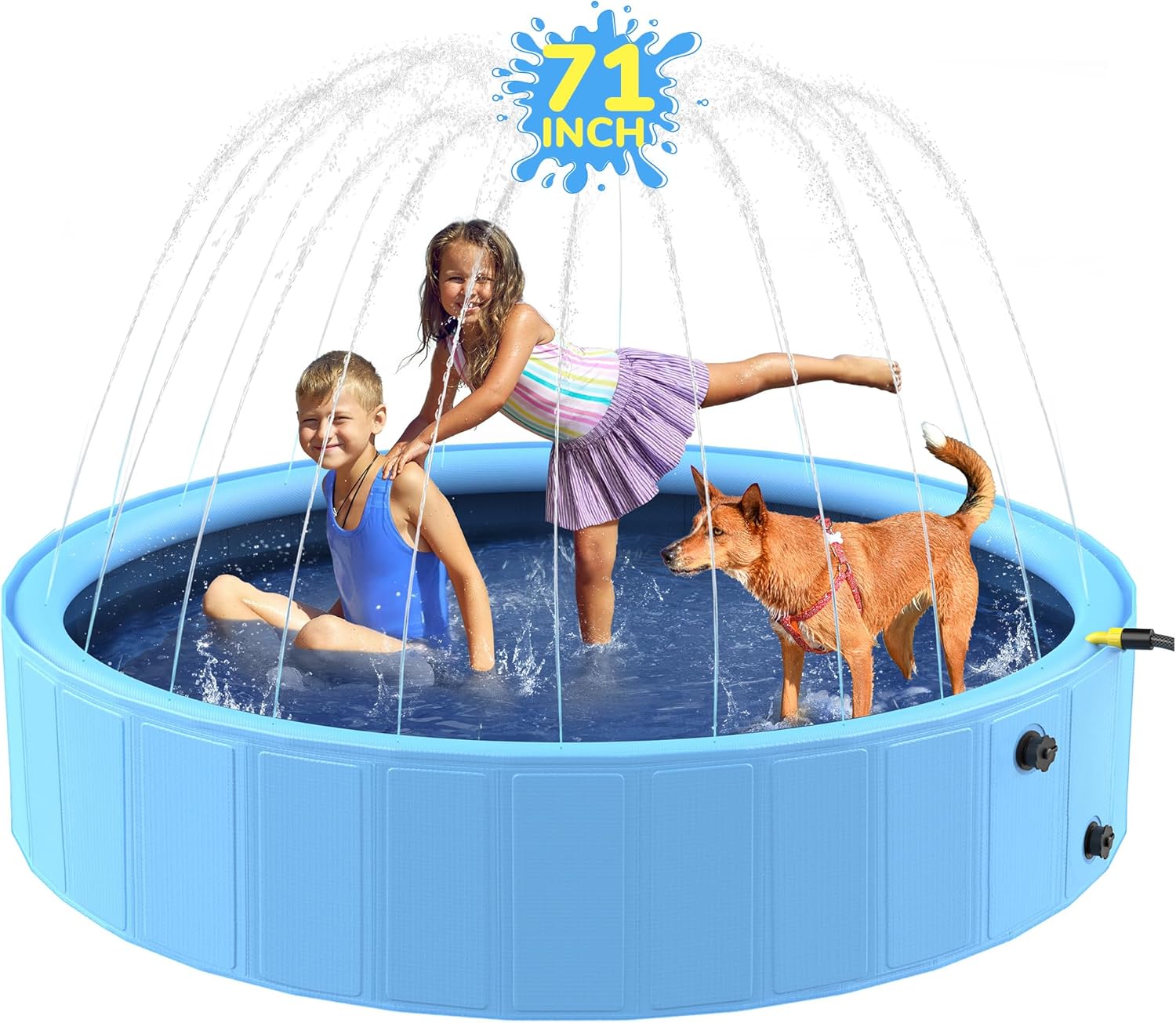 Built-In Sprinkler Fun – Simply connect your garden hose to the water inlet and watch water spray upward from the rim holes. Adjust water pressure to control spray height (low, medium, high) for refreshing summer play.