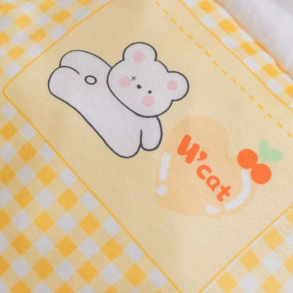 The warm yellow gingham pattern combined with the cute embroidered character adds charm to any home. The cushioned raised border also doubles as a chin rest—perfect for the “sleep with eyes half-open” nap style. -